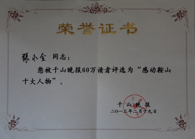 在《千山晚報》創(chuàng)刊20周年之際,很榮幸獲得《千山晚報》評選的“感動鞍山十大人物”。