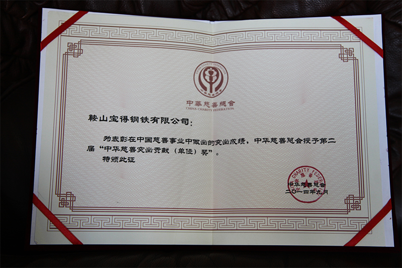為表彰在中國慈善事業(yè)中作出的突出貢獻(xiàn),中華慈善總會授予公司第二屆“中華慈善突出貢獻(xiàn)(單位)獎”。5月20日,副市長陳守義、市民政局局長解永浮、副局長龔毅濤及市慈善總會領(lǐng)導(dǎo)到公司頒獎,董事長、總經(jīng)理接受頒獎。