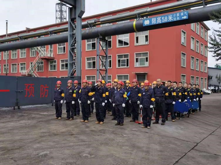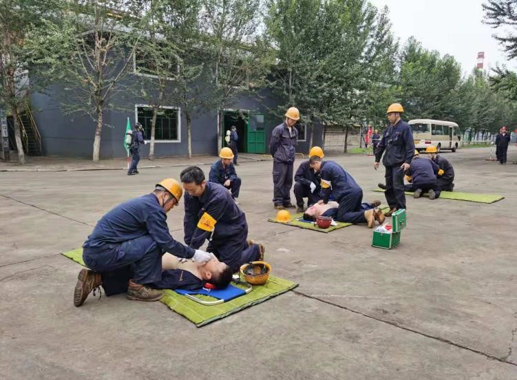 “報(bào)告馬廠長:我是當(dāng)班維護(hù)班長曹雷,9點(diǎn)35分左右班內(nèi)三名員工在煤氣閥組平臺巡檢過程中發(fā)生煤氣中毒事故,請求立即支援”……;“請搶險(xiǎn)救援組、安全警戒組、醫(yī)療救護(hù)組…立即趕赴事故現(xiàn)場集結(jié)”;“報(bào)告總指揮:搶險(xiǎn)救援組10人到達(dá)現(xiàn)場,6套呼吸器及3副擔(dān)架救援裝備完好,可正常使用”……;“各救援小組按預(yù)案規(guī)定程序及商定的實(shí)施方案,立即展開救援行動”……;“報(bào)告總指揮:三名傷者已成功救出,兩人中毒較重,一人較輕,……”;“報(bào)告總指揮:煤氣泄漏部位搶修完畢,已無泄漏現(xiàn)象,設(shè)備可正常運(yùn)行”……。隨著一條條救援指令的下達(dá),現(xiàn)場警戒、現(xiàn)場救援、傷員急救、設(shè)備搶修、現(xiàn)場清理及組織生產(chǎn)恢復(fù)等過程緊張、有序地完成,實(shí)戰(zhàn)演練圓滿結(jié)束。