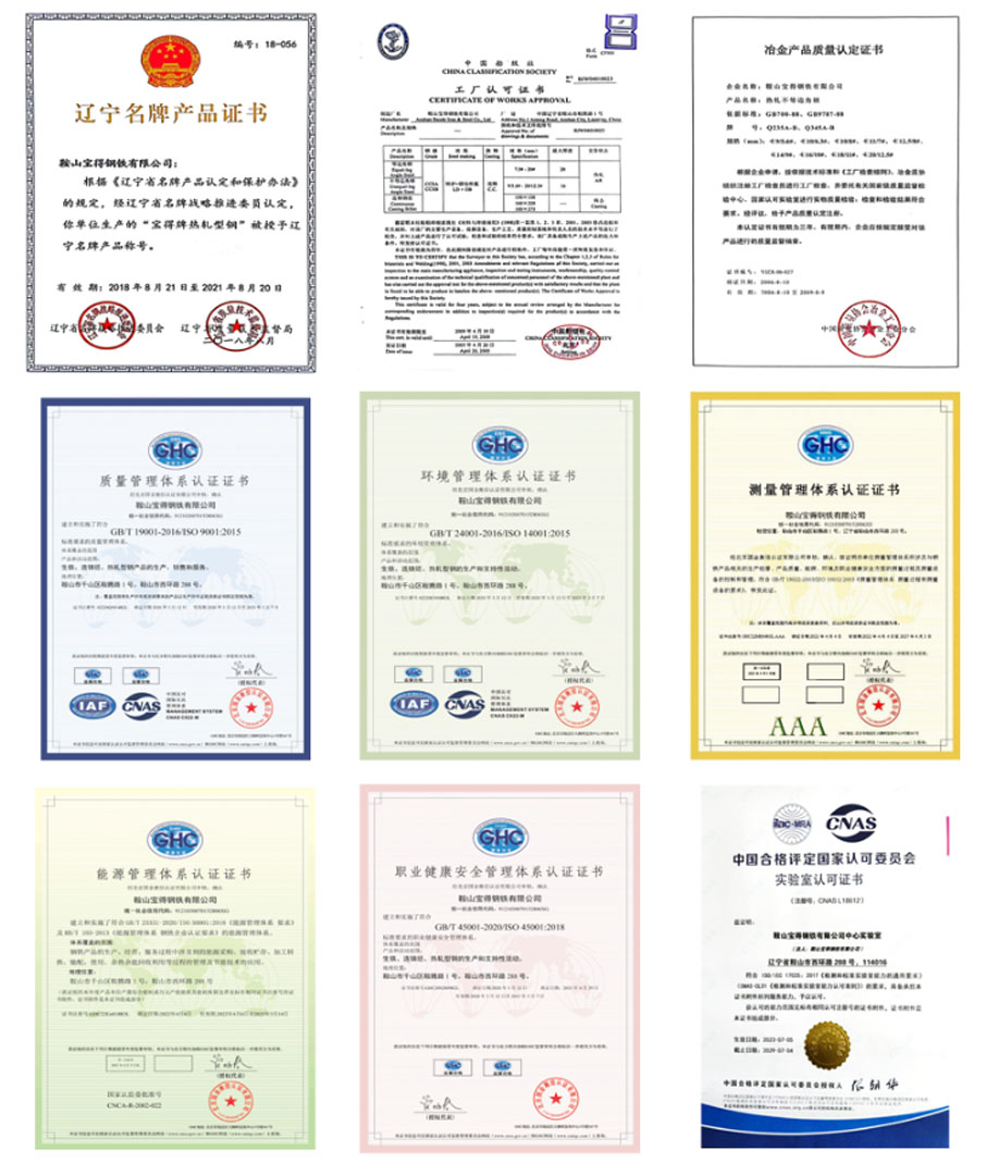 “寶得”牌鋼材以科學的管理,先進的裝備,嚴格的檢測為保障,產(chǎn)品外型尺寸精度高,成分穩(wěn)定,性能可靠,表面質(zhì)量好,實物質(zhì)量高于國家標準,達到發(fā)達國家同類產(chǎn)品水平,屢獲國家“冶金產(chǎn)品實物質(zhì)量金杯獎” 和“遼寧省名牌產(chǎn)品”稱號。公司通過了GB/T 19001/ISO 9001質(zhì)量管理體系、GB/T 24001/ ISO 14001環(huán)境管理體系、GB/T 45001/ISO 45001職業(yè)健康安全管理體系、GB/T 23331 / ISO 50001和RB/T 103能源管理體系、GB/T 19022/ISO 10012測量管理體系審核認證,獲得方圓標志認證中心頒發(fā)的“管理創(chuàng)新獎”,取得國家船級社(CCS)的生產(chǎn)工廠認可證書和遼寧省進出口檢驗檢疫局頒發(fā)的“產(chǎn)品出口免檢認可證書”。